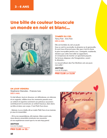 103-6 ANSUNJOUR VIENDRAStephanieStansbie-FrancesIvesDÈS5ANSCebelalbumtoutendouceurendélicatesseensilencesetenregardscélèbretouslesmomentspassésavecunenfantetexprimecommentcesprécieuxsouvenirscontribuerontàconstruireunenfantheureuxbiendanssatêteetdanssoncorpsC’estPetitOursbrun-MamantuessibelleditunmatinPetitOursàsamamanjeveuxteressembler.-OhtumeressemblerasditmamanMaisavantcelanousdevonsensembleconstruirenossouvenirsetnosexpériencesavantquetunesoistropgrand10277234Livrede32pagesPRIX CLUBchf 22–TOMBÉEDUCIELTerryFan-EricFanDÈS4ANSElleesttombéeducielun jeudiQuecesoitlacoccinellelephasmeoulagrenouilleilssonttousd'accordpourdirequec'estlachoselaplusincroyable jamaisvueL'araignéeroublardedéclarequecettemerveilleluiappartientets'empressedemonterunspectaclepayantSafortunedépassevitel'imaginationavantledésastreLenouvelalbumdesFanBrothersestunepuremerveille10277245Livrede56pagesPRIX CLUBchf 2150Unebilledecouleurbousculeunmondeennoiretblanc…FL2168page page10 10MAQUETTE MONTAGEDate DPDFate PFLSJanvier