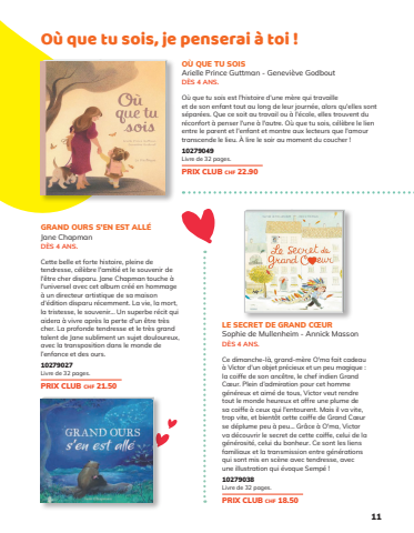 11Oùquetusois jepenseraiàtoiOÙQUETUSOISAriellePrinceGuttman-GenevièveGodboutDÈS4ANSOùquetusoisestl'histoired'unemèrequitravailleetdesonenfanttoutaulongdeleur journéealorsqu'ellessontséparéesQuecesoitautravailouàl'écoleellestrouventduréconfortàpenserl'uneàl'autreOùquetusoiscélèbrelelienentreleparentetl'enfantetmontreauxlecteursquel'amourtranscendelelieuÀlirelesoiraumomentducoucher,10279049Livrede32pagesPRIX CLUBchf2290LESECRETDEGRANDCŒURSophiedeMullenheim-AnnickMassonDÈS4ANSCedimanche-làgrand-mèreO'mafaitcadeauà Victord'unobjetprécieuxetunpeumagiquelacoiffedesonancêtrelechefindienGrandCœurPleind’admirationpourcethommegénéreuxetaimédetousVictorveutrendretoutlemondeheureuxetoffreuneplumedesacoiffeàceuxquil'entourentMaisilvavitetropviteetbientôtcettecoiffedeGrandCœursedéplumepeuàpeu…GrâceàO'maVictorvadécouvrirlesecretdecettecoiffeceluidelagénérositéceluidubonheurCesontlesliensfamiliauxetlatransmissionentregénérationsquisontmisenscèneavectendresseavecuneillustrationquiévoqueSempé10279038Livrede32pagesPRIX CLUBchf1850GRANDOURSS'ENEST ALLÉJaneChapmanDÈS4ANSCettebelleetfortehistoirepleinedetendressecélèbrel'amitiéetlesouvenirdel'êtrecherdisparu JaneChapmantoucheàl'universelaveccetalbumcrééenhommageàundirecteurartistiquedesamaisond'éditiondisparurécemmentLavielamortlatristesselesouvenirUnsuperberécitquiaideraàvivreaprèslaperted'unêtretrèscherLaprofondetendresseetletrèsgrandtalentde Janesublimentunsujetdouloureuxaveclatranspositiondanslemondedel’enfanceetdesours10279027Livrede32pagesPRIX CLUBchf2150FL2168page page 111 11MAQUETTE MONTAGEDate DaPDFate PFLSJanvier