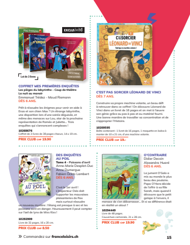 C’ESTPASSORCIERLÉONARDDE VINCIDÈS7ANSConstruiresapropremachinevolanteunbeaudéfiàretrouverdanscecoffretOndécouvreLéonarddeVincidansunlivretde16pagesetonmetàl’œuvresongéniegrâceaupasàpasetaumatérielfourniUnebonnemanièredetravaillersaconcentrationetdes’approprierl’Histoire10209595Boîtecontenant1livretde16pages1maquetteenbalsaàmonterde10x21cmd’unemachinevolantePRIX CLUBchf19-O’CONTRAIREDidierDecoinAlexandraHuardDÈS6ANSLa jumentO’GaloamisaumondeleplusbeaudespoulainsPapaO’Haradécidedel’offriràsafilleSarahmaisquandildécouvrequelepetitgalopeàl’enversilmenacedes’endébarrasser…Etsisadifférenceétaitenréalitéunatout10294449Livrede48pagesCouverturecartonnée21x28cmPRIX CLUBchf1990COFFRETMESPREMIÈRESENQUÊTESLespiègesdulabyrinthe-CoupdethéâtreLanuitaumanoirEmmanuelTrédez-MaudRiemannDÈS6ANSPrêtàrésoudrelesénigmespourvenirenaideàEnzoetsonchienMaxUnétrangelabyrintheunedisparitionlorsd’unesoiréedéguiséeetmêmedesmenacessurLoustardelaprochainereprésentationdeRoméoet Juliette…Troisenquêtesquis’annoncentcomplexes10268676Coffretde3livresde38pageschacun14x19cmPRIX CLUBchf1990DESENQUÊTESAUPOILTome4-Poissonsd’avrilAnne-MarieDesplat-DucAnneDumergueFabienÖcktoLambertDÈS6ANSC’estle1eravrilL’inspecteurOslodoitsupporterlesmauvaisesplaisanteriesdeRexmaissurtoutrésoudreunnouveaumystèrel’étangestpresqueàsecetlespoissonssontendangerHeureusementilpeutcomptersurl’œildelynxdeMissKiss10292909Livrede32pages16x20cmPRIX CLUBchf850Lotde3livresCommandezsurfranceloisirsch15FLS218page15MONTAGEDatePDFMai- Juin202231mai20221800