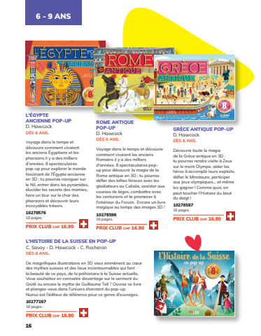166-9 ANSL'HISTOIREDELASUISSEENPOP-UPCSavoy-DHawcock-CRocheronDÈS6ANSDemagnifiquesillustrationsen3DvousemmènentaucœurdesmythessuissesetdeslieuxincontournablesquifontlabeautédecepaysdelapréhistoireàlaSuisseactuelleVoussouhaitezenconnaitredavantagesurlesermentduGrütliouencorelemythedeGuillaumeTellOuvrezcelivreetplongez-vousdansl'universétonnantdupop-upNuinuiestl'éditeurderéférencepourcegenred'ouvrages1027726716pagesPRIX CLUBchf 1690GRÈCE ANTIQUEPOP-UPDHawcockDÈS6ANSDécouvretoutelamagiedelaGrèceantiqueen3DtupourrasrendrevisiteàZeussurlemontOlympeaiderleshérosàaccomplirleursexploitsdéfierleMinotaureparticiperaux JeuxolympiquesetmêmelesgagnerCommequoionpeuttoucherl'Histoireduboutdudoigt1027858716pagesPRIX CLUBchf 1690ROME ANTIQUEPOP-UPDHawcockDÈS6ANSVoyagedansletempsetdécouvrecommentvivaientlesanciensRomainsilyadesmilliersd'années8spectaculairespopuppourdécouvrirlamagiedelaRomeantiqueen3DtupourrasdéfierdesbêtesférocesaveclesgladiateursauColiséeassisterauxcoursesdebigescombattreaveclescenturionsettepromeneràl'intérieurduForumEncoreunlivremagiqueautempsdesimages3D1027859816pagesPRIX CLUBchf 1690L'ÉGYPTEANCIENNEPOP-UPDHawcockDÈS6ANSVoyagedansletempsetdécouvrecommentvivaientlesanciensÉgyptiensetlespharaonsilyadesmilliersd'années8spectaculairespop-uppourexplorerlemondefascinantdel'Égypteancienneen3DtupourrasnaviguersurleNilentrerdanslespyramideséluciderlessecretsdesmomiesfaireuntoursurlechardespharaonsetdécouvrirleursincroyablestrésors1027857616pagesPRIX CLUBchf 1690FLS218page16MONTAGEDatePDFMai- Juin202231mai20221759