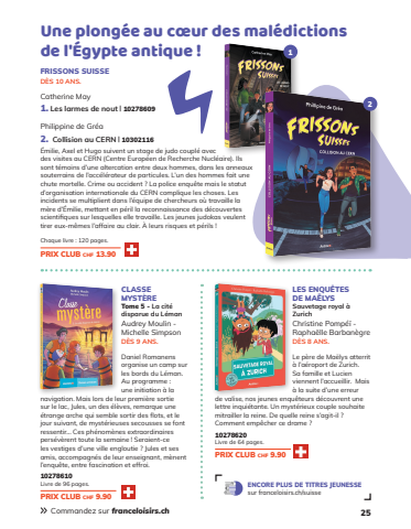 25CLASSEMYSTÈRETome5-LacitédisparueduLémanAudreyMoulin-MichelleSimpsonDÈS9ANSDanielRomanensorganiseuncampsurlesbordsduLémanAuprogrammeuneinitiationàlanavigationMaislorsdeleurpremièresortiesurlelac JulesundesélèvesremarqueuneétrangearchequisemblesortirdesflotsetlejoursuivantdemystérieusessecoussessefontressentirCesphénomènesextraordinairespersévèrenttoutelasemaineSeraient-celesvestigesd’unevilleengloutie Julesetsesamisaccompagnésdeleurenseignantmènentl’enquêteentrefascinationeteffroi10278610Livrede96pagesPRIX CLUBchf990Uneplongéeaucœurdesmalédictionsdel'ÉgypteantiqueLESENQUÊTESDEMAËLYSSauvetageroyalàZurichChristinePompéï-RaphaëlleBarbanègreDÈS8ANSLepèredeMaëlysatterritàl’aéroportdeZurichSafamilleetLucienviennentl’accueillirMaisàlasuited’uneerreurdevalisenos jeunesenquêteursdécouvrentunelettreinquiétanteUnmystérieuxcouplesouhaitemitraillerlareineDequellereines’agit-ilCommentempêchercedrame10278620Livrede64pagesPRIX CLUBchf99012ENCOREPLUSDETITRESJEUNESSEsurfranceloisirsch/suisseFRISSONSSUISSEDÈS10ANSCatherineMay1Leslarmesdenout|10278609PhilippinedeGréa2CollisionauCERN|10302116ÉmilieAxeletHugosuiventunstagede judocoupléavecdesvisitesauCERN(CentreEuropéendeRechercheNucléaire)Ilssonttémoinsd’unealtercationentredeuxhommesdanslesanneauxsouterrainsdel’accélérateurdeparticulesL’undeshommesfaitunechutemortelleCrimeouaccidentLapoliceenquêtemaislestatutd’organisationinternationaleduCERNcompliqueleschosesLesincidentssemultiplientdansl’équipedechercheursoùtravaillelamèred’ÉmiliemettantenpérillareconnaissancedesdécouvertesscientifiquessurlesquelleselletravailleLes jeunes judokasveulenttirereux-mêmesl’affaireauclairÀleursrisquesetpérilsChaquelivre120pagesPRIX CLUBchf 1390CommandezsurfranceloisirschFLS218page25MONTAGEDatePDFMai- Juin202231mai20221802