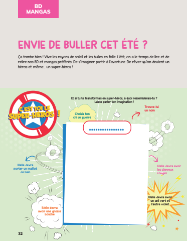 32BDMANGASENVIEDEBULLERCETÉTÉÇatombebienVivelesrayonsdesoleiletlesbullesenfolieL’étéonaletempsdelireetderelirenosBDetmangaspréférésDes’imaginerpartiràl’aventureDerêverqu’ondevientunhérosetmême…unsuper-hérosEtsi tu te transformaisensuper-hérosàquoiressemblerais-tuLaisseparler tonimaginationIl/elledevraavoirlescheveuxrougesTrouve-luiunnomIl/elledevraavoirunœilvertetl’autrevioletIl/elledevraavoirunegrosseboucheIl/elledevraporterunmaillotdebainChoisistoncrideguerreC'EST