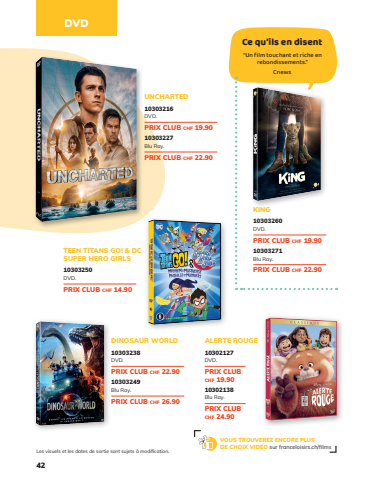 42LesvisuelsetlesdatesdesortiesontsujetsàmodificationVOUSTROUVEREZENCOREPLUSDECHOIX VIDÉOsurfranceloisirsch/filmsKING10303260DVDPRIX CLUBchf 199010303271BluRayPRIX CLUBchf 2290UNCHARTED10303216DVDPRIX CLUBchf 199010303227BluRayPRIX CLUBchf 2290Cequ’ilsendisent “Unfilmtouchantetricheenrebondissements”CnewsTEENTITANSGO&DCSUPERHEROGIRLS10303250DVDPRIX CLUBchf 1490DINOSAURWORLD10303238DVDPRIX CLUBchf 229010303249BluRayPRIX CLUBchf 2690ALERTEROUGE10302127DVDPRIX CLUBchf 199010302138BluRayPRIX CLUBchf 2490DVDFLS FLS218218page page42 42MONTAGE MONTAGEDate DatePDFPDFFLS FLSMai Mai- - juin juin2021 202131 31mai mai2022 202218180505218218page page42 42MONTAGE MONTAGEDate DatePDFPDFMai Mai- - juin juin2021 202131 31mai mai2022 202218180505