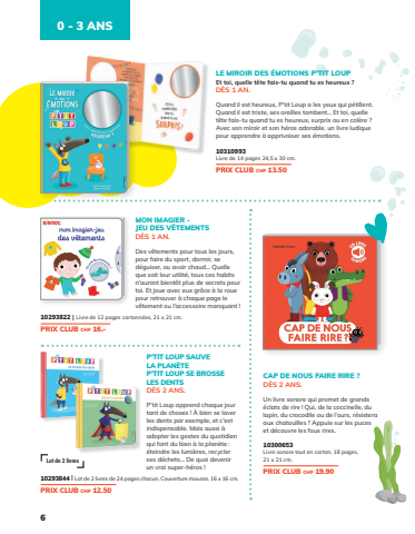 LEMIROIRDESÉMOTIONSP’TITLOUPEttoiquelletêtefais-tuquandtuesheureuxDÈS1ANQuandilestheureuxP’titLoupalesyeuxquipétillentQuandilesttristesesoreillestombent…Ettoiquelletêtefais-tuquandtuesheureuxsurprisouencolèreAvecsonmiroiretsonhérosadorableunlivreludiquepourapprendreàapprivoisersesémotions10310993Livrede14pages245x30cmPRIX CLUBchf1350CAPDENOUSFAIRERIREDÈS2ANSUnlivresonorequiprometdegrandséclatsderireQuidelacoccinelledulapinducrocodileoudel’oursrésisteraauxchatouillesAppuiesurlespucesetdécouvrelesfousrires10300653Livresonoretoutencarton18pages21x21cmPRIX CLUBchf1990MONIMAGIER-JEUDES VÊTEMENTSDÈS1ANDesvêtementspourtousles jourspourfairedusportdormirsedéguiserouavoirchaud…Quellequesoitleurutilitétousceshabitsn’aurontbientôtplusdesecretspourtoiEt joueaveceuxgrâceàlarouepourretrouveràchaquepagelevêtementoul’accessoiremanquantP’TITLOUPSAUVELAPLANÈTEP’TITLOUPSEBROSSELESDENTSDÈS2ANSP’titLoupapprendchaque jourtantdechosesÀbienselaverlesdentsparexempleetc’estindispensableMaisaussiàadopterlesgestesduquotidienquifontdubienàlaplanèteéteindreleslumièresrecyclersesdéchets…Dequoidevenirunvraisuper-héros10293822|Livrede12pagescartonnées21x21cmPRIX CLUBchf16-Lotde2livres10293844|Lotde2livresde24pageschacunCouverturemousse16 x16cmPRIX CLUBchf125060-3 ANSFLS218page6MONTAGEDatePDFMai-Juin202231mai20221755