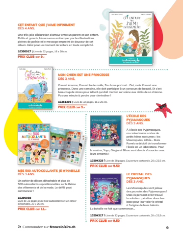 9MONCHIENESTUNEPRINCESSEDÈS3ANSZouesténormeZouesttoutemolleZoubavepartout…OuimaisZouestuneprincesseDansunesemaineelledoitparticiperàunconcoursdebeautéEtc’estbeaucoupdestresspourAlbertquidoitmontersurscèneauxcôtésdesachiennePasuneminuteàperdrepours’entraîner10261306|Livrede32pages16x20cmPRIX CLUBchf9-LECRISTALDESPYJAMASQUESDÈS3ANSLesMascrapulessont jalouxdespouvoirsdesPyjamasquesMaisilspensentavoirtrouvélasolutionpénétrerdansleurbasepourleurvolerlecristalàl’originedeleurstalentsLabataillenefaitquecommencer…10294317|Livrede32pagesCouverturecartonnée20x225cmPRIX CLUBchf950L’ÉCOLEDESPYJAMASQUESDÈS3ANSÀl’écoledesPyjamasquesoncroisetoutessortesdepetitshérosnocturneslesMascrapulesLilifée…MaisRoméoadécidédetransformerl’écoleenunlaboratoirePourlecontrer YoyoGlugluetBibouvontdevoirs’associeravecleursennemis10294328|Livrede28pagesCouverturecartonnée20x225cmPRIX CLUBchf950CETENFANTQUEJ’AIMEINFINIMENTDÈS4ANSUnetrès joliedéclarationd’amourentreunparentetsonenfantPetitsetgrandslaissez-vousembarquerparlesillustrationspleinesdepoésieetlemessageempreintdedouceurdecetalbumIdéalpourunmomentdelectureentoutecomplicité10300917|Livrede32pages16x20cmPRIX CLUBchf9-MES500 AUTOCOLLANTSJEM’HABILLEDÈS3ANSUncahierdedécorsdétachableetplusde500autocollantsrepositionnablessurle thèmedesvêtementsetdelamodeLedéfilépeutcommencer10296088Livrede32pagesavec500autocollantsetuncahierdétachable20x26cmPRIX CLUBchf11-CommandezsurfranceloisirschFL2168page page 99 9MAQUETTE MONTAGEDate DaPDFate PFLSJanvier