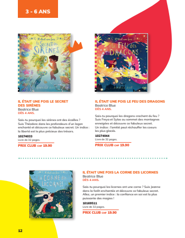 123-6 ANSILÉTAITUNEFOISLESECRETDESSIRÈNESBeatriceBlueDÈS4ANSSais-tupourquoilessirènesontdesécaillesSuisThéodoredanslesprofondeursd’unlagonenchantéetdécouvrecefabuleuxsecretUnindicelalibertéestleplusprécieuxdestrésors10274033Livrede32pagesPRIX CLUBchf 1990ILÉTAITUNEFOISLEFEUDESDRAGONSBeatriceBlueDÈS4ANSSais-tupourquoilesdragonscrachentdufeuSuisFreyaetSylasausommetdesmontagnesenneigéesetdécouvrecefabuleuxsecretUnindicel’amitiépeutréchaufferlescoeurslesplusglacés10274044Livrede32pagesPRIX CLUBchf 1990ILÉTAITUNEFOISLACORNEDESLICORNESBeatriceBlueDÈS4ANSSais-tupourquoileslicornesontunecorneSuis JeannedanslaforêtenchantéeetdécouvrecefabuleuxsecretAllezunpremierindicelaconfianceensoiestlapluspuissantedesmagies10169511Livrede32pagesPRIX CLUBchf 1990FL2168page page12 12MAQUETTE MONTAGEDate DPDFate PFLSJanvier
