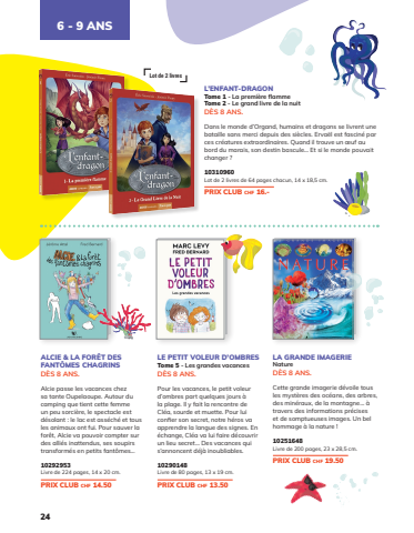 246-9 ANSL’ENFANT-DRAGONTome1-Lapremière flammeTome2-LegrandlivredelanuitDÈS8ANSDanslemonded’OrgandhumainsetdragonsselivrentunebataillesansmercidepuisdessièclesErvaëlestfascinéparcescréaturesextraordinairesQuandiltrouveunœufauborddumaraissondestinbascule…Etsilemondepouvaitchanger10310960Lotde2livresde64pageschacun14x185cmPRIX CLUBchf 16-ALCIE&LAFORÊTDESFANTÔMESCHAGRINSDÈS8ANSAlciepasselesvacanceschezsatanteOupelaoupeAutourducampingquetientcettefemmeunpeusorcièrelespectacleestdésolantlelacestasséchéettouslesanimauxontfuiPoursauverlaforêtAlcievapouvoircomptersurdesalliésinattendussessoupirstransformésenpetitsfantômes…10292953Livrede224pages14x20cmPRIX CLUBchf 1450LEPETIT VOLEURD’OMBRESTome5-Lesgrandes vacancesDÈS8ANSPourlesvacanceslepetitvoleurd’ombrespartquelques joursàlaplageIlyfaitlarencontredeCléasourdeetmuettePourluiconfiersonsecretnotrehérosvaapprendrelalanguedessignesEnéchangeCléavaluifairedécouvrirunlieusecret…Desvacancesquis’annoncentdéjàinoubliables10290148Livrede80pages13x19cmPRIX CLUBchf 1350LAGRANDEIMAGERIENatureDÈS8ANSCettegrandeimageriedévoiletouslesmystèresdesocéansdesarbresdesminérauxdelamontagne…àtraversdesinformationsprécisesetdesomptueusesimagesUnbelhommageàlanature10251648Livrede200pages23x285cmPRIX CLUBchf 1950Lotde2livresFLS218page24MONTAGEDatePDFMai- Juin202231mai20221802