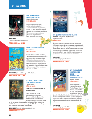 289-12 ANSLES AVENTURESDUJEUNELUPINMartaPalazzesiDÈS10ANSFaisconnaissanceavecunhérosindémodableAdolescentmalinetgénéreuxLupin14ansdécouvreleplanfunestedumystérieuxMonsieurMoustacheresponsabledeplusieursdisparitionsfairesauterlatourEiffelVIVELES VACANCESEnidBlytonDÈS10ANSParl’autriceduClubdesCinq26histoiresintemporellesautourduthèmedesvacancesDesrécitsd’aventuresdescontesauxcréaturesfantastiquesoudeschroniquesàlaplageoùilestquestiond’amitiédepartageetdecourage…Pourles jeunesde11à77ansJEANNELAFILLEDUDOCTEURLOISEAUCaroleTréborDÈS10ANSTome1-LecadeaudeKikideMontparnasseDansleParisde1924la jeune JeannerêvededevenirmédecinQuanddesmédicamentssontdérobésdanslapharmaciedesononcleetdesatanteelles’inquiètedelasantédesvoleursetdécidedemenersapropreenquêteD’indiceenindiceelledécouvrelequartierdesartistes…10290203|Livrede220pages14x20cmPRIX CLUBchf 17-10151438|Livrede288pages135x215cmPRIX CLUBchf 179010264650Livrede216pages135x20cmPRIX CLUBchf 1790LAQUÊTEDURENARDBLANCTome1-LapierreMystérieuseChen JiatongDÈS9ANSÀlamortdesesparentsDilahlerenardeauhériteunepierredelunemagiquecapabledeleguider jusqu’àunlieuquipourraitletransformerenhumainMaiscetrésorestconvoitéparunehordederenardsbleus…DilahdoitfuirEntreennemisprêtsàtoutetalliésinattendusunequêtericheenaventuresetenémotions10292997Livrede232pages15x21cmPRIX CLUBchf 1950LAFABULEUSEHISTOIREDECINQORPHELINSINADOPTABLESHanaTookeDÈS10ANSMilouagrandiàl’orphelinatdelaPetiteTulipeCommeFennaSemLottaetEggsonprofilestatypiqueetellen’ajamaisétéadoptéeLadirectricemènelaviedureauxcinqinséparablesQuandellepasseunaccordavecunsinistrenégociantpoursedébarrasserd’euxlapetitebandedécidedes’évader10290214Livrede378pages14x23cmPRIX CLUBchf 2390FLS213page28MONTAGEDatePDFJuillet-Aoüt202131mai20221805