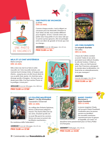 Commandezsur29franceloisirschUNEPHOTODE VACANCESJoWitekDÈS10ANSCommechaqueannéec’estledépartenvacancespourlesManzattiDirectionleSudMaiscetététoutsembledifférentpourEugénie10ansCoincéeentreunepetitesœurtroppetiteetunesœuradoquinepensequ’auxgarçonselleestpartagéeentresondésirdegrandiretl’enviequeriennechange…10293008|Livrede168pages14x22cmPRIX CLUBchf 19-MILAETLECHATMYSTÉRIEUXMarieLemayrieDÈS10ANSMilaabiendumalàsefaireàcettenouvellevieUnenouvellemaisonunemamantoutletempstristeettoujourspasd’amis… jusqu’au jouroùelletrouvedanslarueunpetitchatperduUnchatbienplusétrangequ’ellen’imagine…EntoutcasnuldoutepourMilailluifautcacherPlumeetleprotégeràtoutprix10311180|Livrede150pages14x195cmPRIX CLUBchf 1790LESCINQELEMENTSLeserpentécarlateDan JolleyDÈS12ANSL’heuredel’ultimecombatasonnéGabeetsesamispensaientavoirdétruitArcadialavilledel’ombreC’étaitunpiègeelleaenfaitfusionnéavecSanFranciscoplongeantlemondedansladésolationUnfinalricheenrebondissementsànepasmanquer10157004Livrede432pages14x20cmPRIX CLUBchf 18-LECOLLÈGEMALÉFIQUETome2-Les filsd’AsmodeusCassandraO’DonnellDÈS12ANSAucollègedesEnfantsSpéciauxEmmaadésormaisintégrélemanoirPasfaciled’êtreloindesesamisd’autantqu’elleestlaseulefilleparmilessorciersEmmaestaussienproieàdeterrifiantscauchemars…Denombreuxdéfisl’attendent10296320|Livrede318pages14x21cmPRIX CLUBchf 1790MAGICCHARLYBienvenueàSaint-FouettardDÈS12ANSLe jeunemagicienCharlyestenvoyéàSaint-Fouettardl’institutionpourles jeunessorciersenperditionDenouvellesaventurescommencentpourlegarçonetSapotillesonamieUndeuxième tomepassionnantpourceHarryPotteràla française10254057|528pages15x22cmPRIX CLUBchf 2390FLS218page29MONTAGEDatePDFMai- Juin202231mai20221805