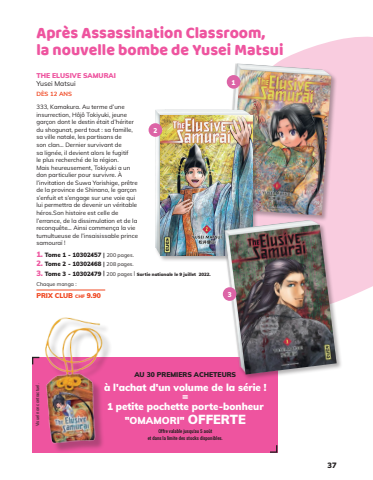 AU30PREMIERS ACHETEURSàl'achatd'un volumedelasérie=1petitepochetteporte-bonheurOMAMORIOFFERTEOffrevalable jusqu'au5aoûtetdanslalimitedesstocksdisponiblesVisuelnoncontractuel37AprèsAssassinationClassroomlanouvellebombedeYuseiMatsuiTHEELUSIVESAMURAIYuseiMatsuiDÈS12ANS333KamakuraAutermed’uneinsurrectionHôjôTokiyuki jeunegarçondontledestinétaitd’hériterdushogunatperdtoutsafamillesavillenatalelespartisansdesonclan…DerniersurvivantdesalignéeildevientalorslefugitifleplusrecherchédelarégionMaisheureusementTokiyukiaundonparticulierpoursurvivreÀl’invitationdeSuwa YorishigeprêtredelaprovincedeShinanolegarçons’enfuitets’engagesurunevoiequiluipermettradedevenirunvéritablehérosSonhistoireestcelledel’errancedeladissimulationetdelareconquête…Ainsicommençalavietumultueusedel’insaisissableprincesamouraï1Tome1-10302457|200pages2Tome2-10302468|208pages3Tome3-10302479|200pages|Sortienationalele9 juillet2022ChaquemangaPRIX CLUBchf 990123FLS218page37MONTAGEDatePDFMai- Juinl202231mai20221806