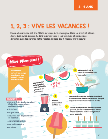 123VIVELESVACANCESEhouiehouil’écoleestfiniePlaceautempslibreetaux jeuxPlaisirdelireicietailleursAlorsquelslivresglisseras-tudanstapetitevaliseFaistonchoixetn’oubliepasdetester,avectesparentsnotrerecettedeglace100%maison100%natureMiam-Miam glacéPetitchefenherbeilesttempsdepréparerdesglacesàl’eauetauxfruitsfraisRetirela peauetles pépins